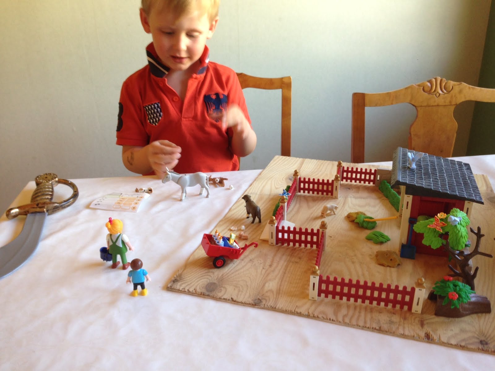 Vi har farmor och farbror F med familj här idag. Bus fick ett superfint Playmobil med sjuka och skadade djur som måste plåstras om. Duktig kille till att bygga.
